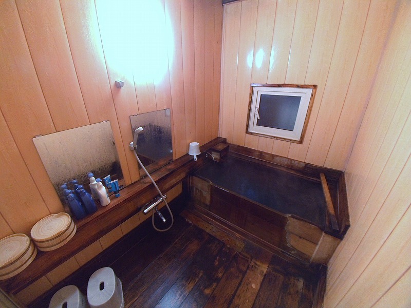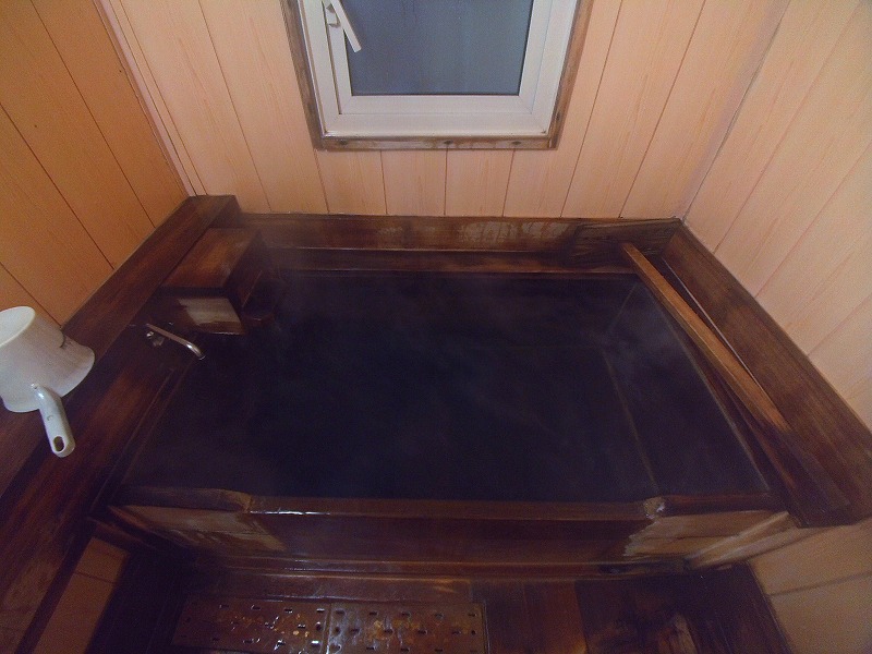 ちょうど湯船の脇には湯もみ用の櫂が、湯口の横に加水用の蛇口がありますので、どちらも駆使して46℃ほどまで温度を下げてから入浴しました。