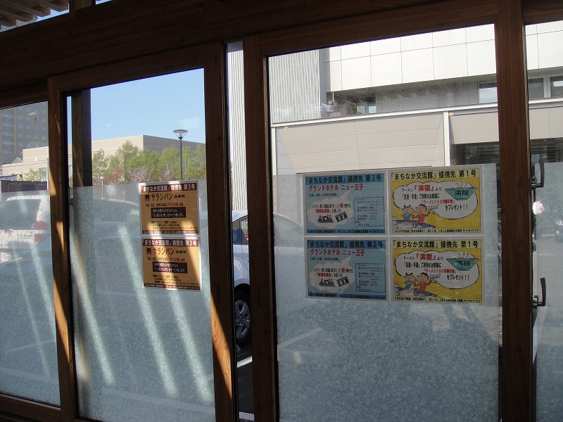 この施設には「地域の観光や地場産品のPR拠点」としての目的もあり、市内の飲食店等とも提携しています。ガラスには提携施設のチラシが貼られています。