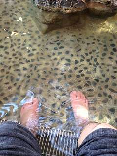 足湯内の温度は測っていませんが少し熱めで、しばらくすると背中に汗がにじんできて、身体が温まってくるのを実感できました。