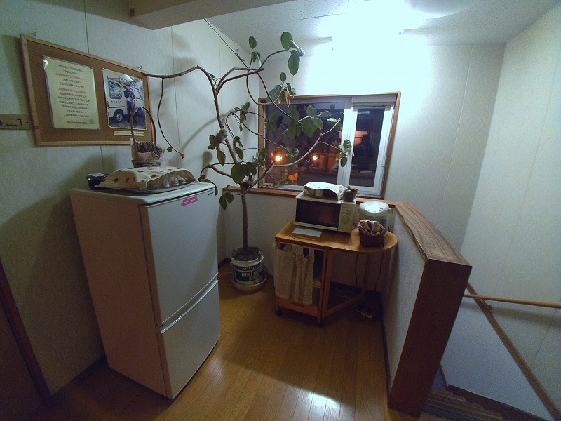 階段を上がってすぐあるのが、共用の冷蔵庫やレンジ、ポットなどのコーナー。冷蔵庫には冷水が用意されています。
