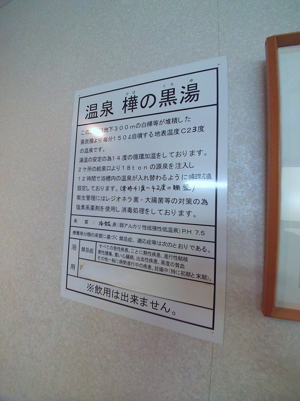 掲示されている平成20年6月の分析書によりますと、こちらの温泉(137-002)は源泉名「女満別温泉(樺の黒湯)」。