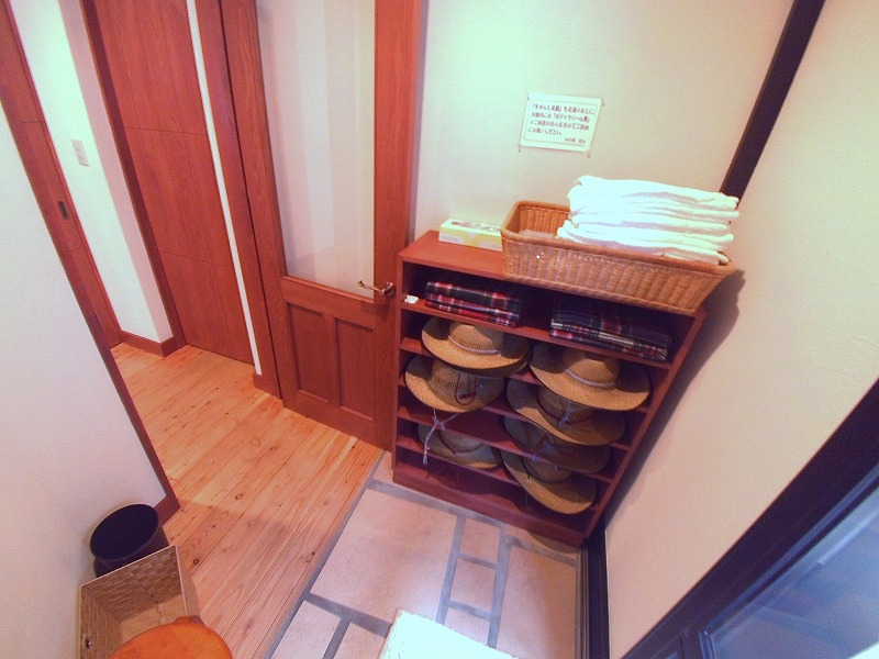 ラウンジから外へ出るところに、足湯のためのコーナーがあります。タオルだけでなく帽子やブランケットもあり。外に出てすぐ更衣室がありますので、女性の方でも気兼ねなく利用できそうです。