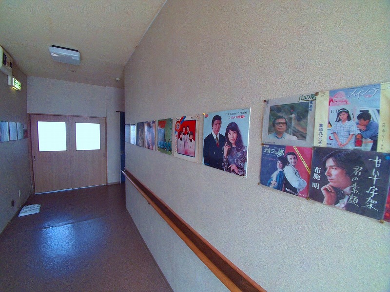 廊下の両側にレコードジャケットが飾られていて印象的。