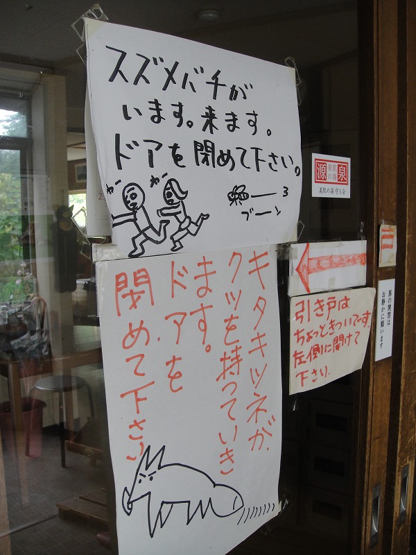 玄関前に立つと、いろいろな張り紙を目にします。