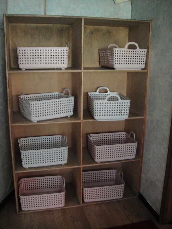 木製の棚に年季の入ったカゴが並びます。