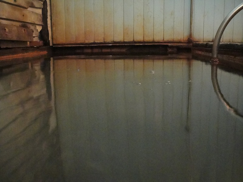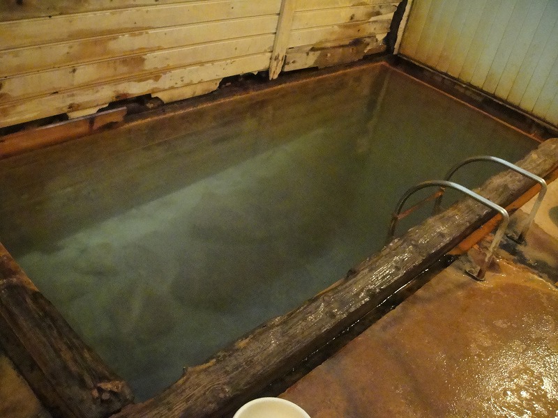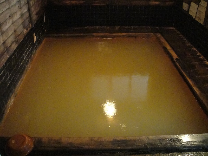 濁り湯の湯船です。日によって色が変わることがあり、以前には年に数回マリンブルーに変わると聞いていましたが、過去3度ともこのような茶色い湯色でした。