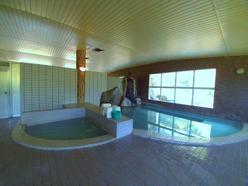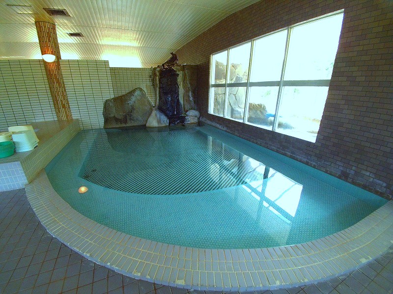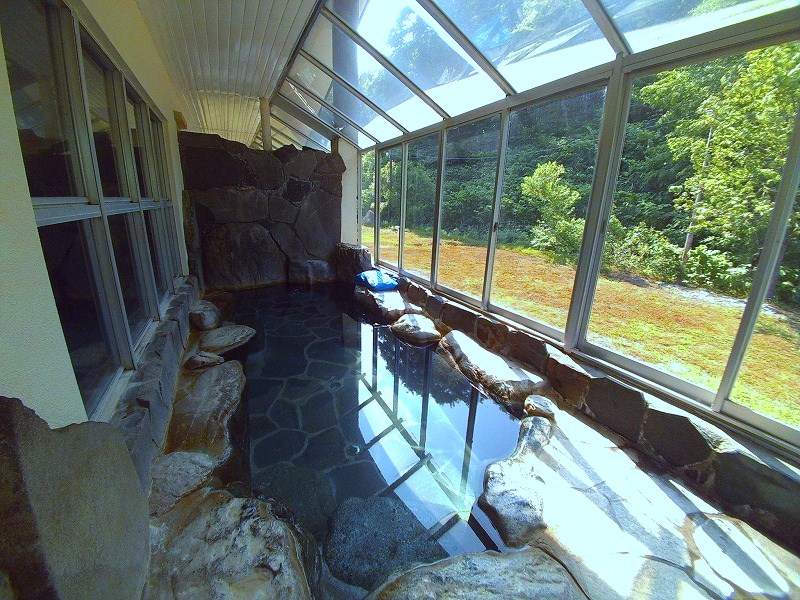 内湯からドアを開けて進むと、「露天風呂」があります。以前は本当の露天風呂だったようですが、現在は虫よけなどの都合でガラス張りの露天風となっていました。