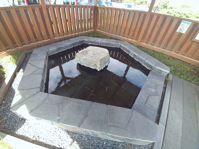 湯船は六角形をしていて、びっしり座れば7-8人ほど利用できそうです。見たところお湯はほぼ透明の様子。