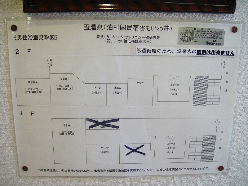 脱衣場に入ると浴室の見取り図がありましたが、こちらの施設は1階にも2階にも脱衣場と浴室があり、浴室同士は階段で行き来できるようになっているようです。