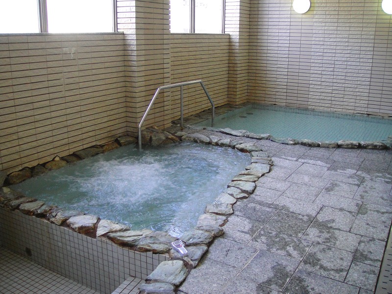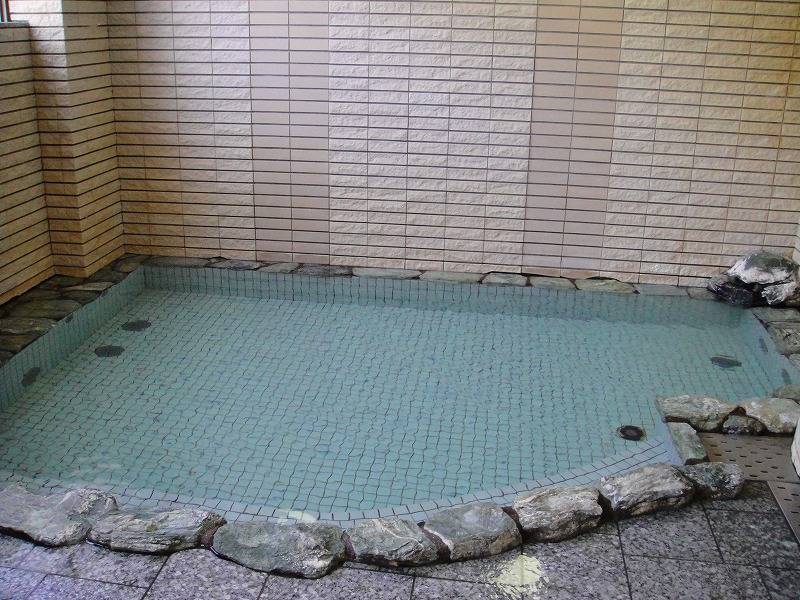 さらに1階よりも小さい真湯のバイブラバス、温泉浴槽が続きます。2階の温泉浴槽は6-7人は入れる大きさで、温度は約43℃。循環していますが、浴槽からのオーバーフローも見られました。