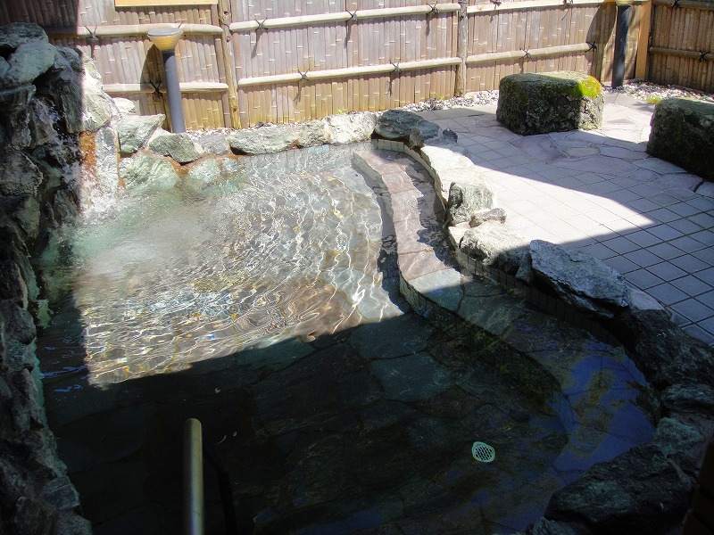 2階の奥には外へ出るドアがあり、そこから階段を降りると露天風呂があります。8-10人ほど入れそうな大きさで、温度は約42℃。