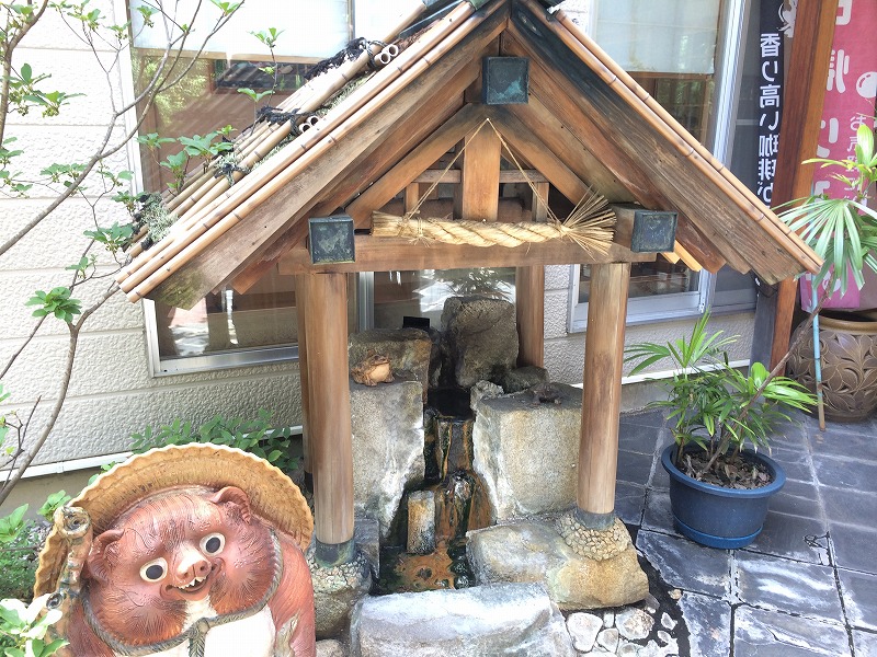 建物の横に車を停め、門をくぐるとまず目に入るのがこのお社です。源泉が流れていて、思わず足が止まりました。