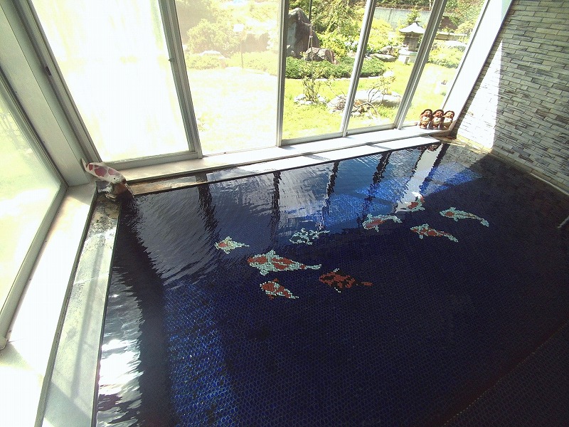 そして、水の中を連想させる群青色のタイルの中、湯口の鯉に向かうように鯉が泳いでいます。ここまで凝ったタイル張りの湯船は道内でも珍しいですね。
