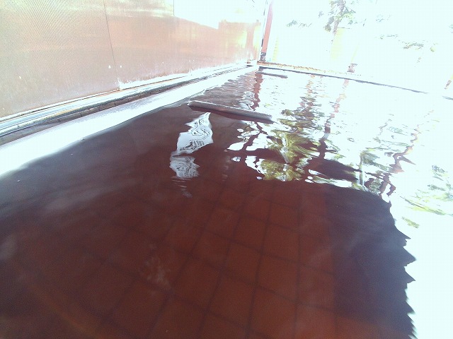 色は濁りのある茶褐色、腐植質が1.7mg/kg含まれているモール温泉で、お湯の中にも湯の花が舞っていますが、カルシウムイオンが比較的多いためか、モール温泉によく見られるヌルツル感ではなくキシキシとした肌触りがしました。
