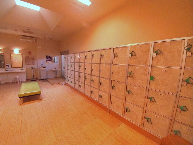 ロッカーが並ぶ広い脱衣場です。建物は一度改装されていますが、このロッカーはコイン不要の古い銭湯などでよく見る差し込み式の鍵で、昔の名残が嬉しく感じられました。