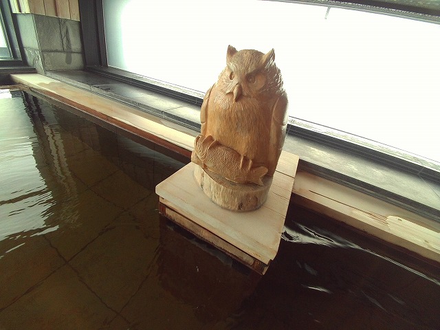 内湯の2つの浴槽ともに湯口にはふくろうが鎮座。
