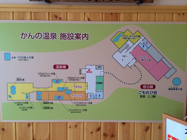 掲示されている館内案内によれば、現在のかんの温泉は「温泉棟」と「宿泊棟(こもれび荘)」の2つの建物で成っていて、お風呂の名前も一新されています。