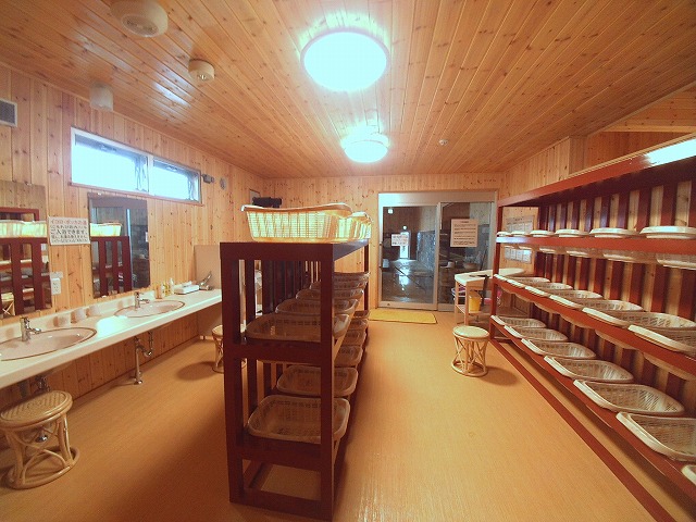 木の棚にカゴが整然と並ぶきれいな脱衣場。