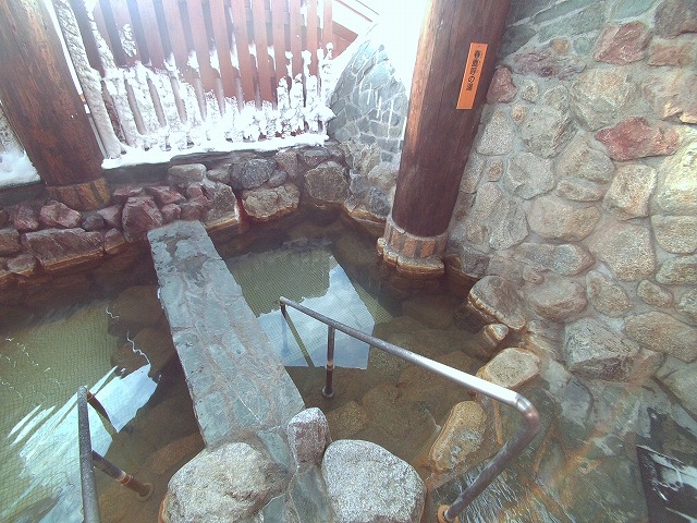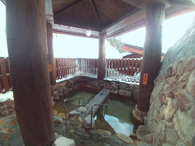奥の洗い場の横を通りドアを開けると、小ぶりながら2つの露天風呂があります。冬は階段を降りるのに注意が必要ですが、両方の湯船を覆うように屋根がかかっていて快適に入れました。