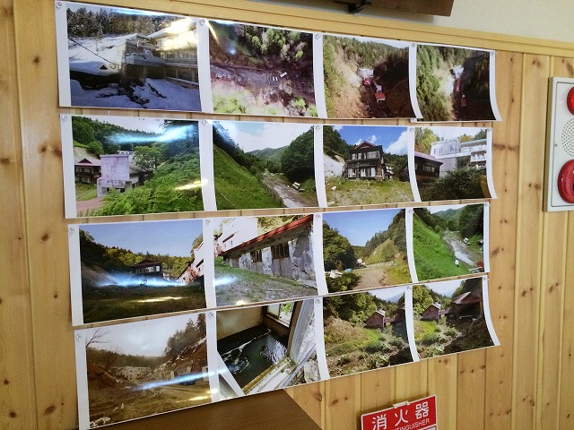 広いロビーにはやペレットストーブがあり、飲料水や雑誌等も置いていますが、中でも目を引くのは工事前後のかんの温泉の写真でした。