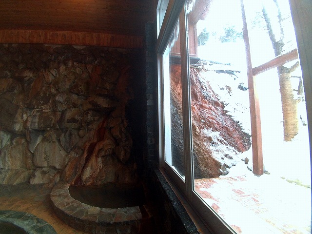 その窓辺の内側の浴室の角にある小さな湯船は、布袋の湯改めシロカニペ(銀の雫)の湯。こちらは湯船の中で40.4℃。