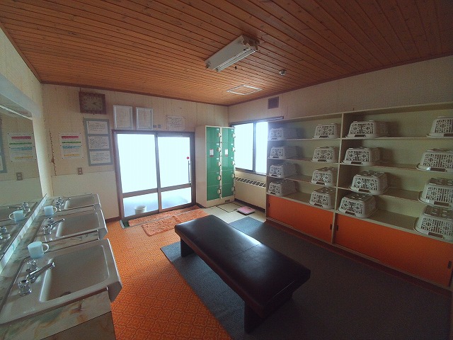 ノスタルジックな脱衣場は、木の棚にプラスチックの脱衣カゴ。