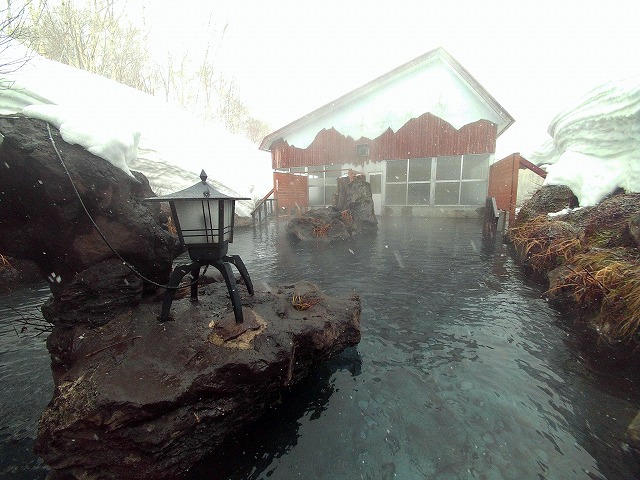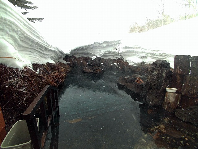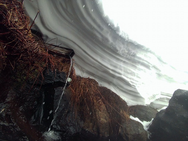露天風呂の奥まで行くと、湯口の辺りは雪がせり出しています。