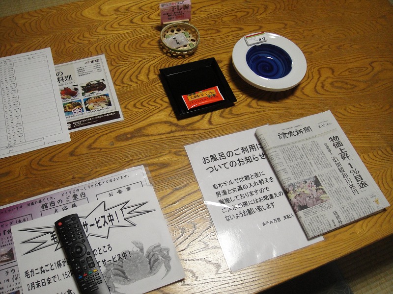 テーブルの上にはお茶請け、各種案内のほかに新聞まであります。