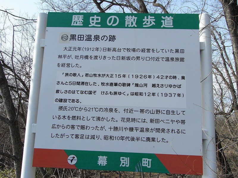 さて、その途別温泉ですが、看板のところから歩いていくと、木などが自生しているものの意外に平らで広い土地で、この敷地のどこかに温泉宿が建っていたんだろうな・・と思いました。