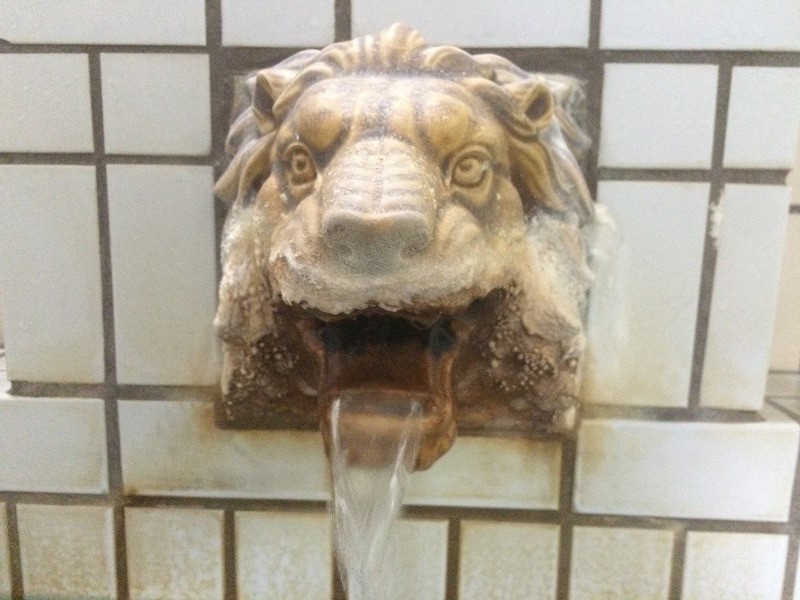 ライオンの湯口から出るお湯の温度は54.7℃。