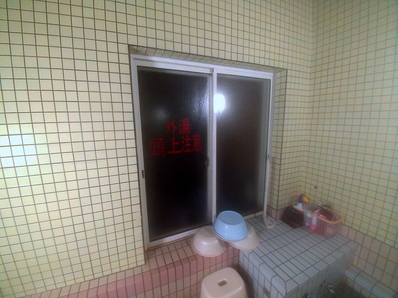 さて、内湯の窓を見ると「外湯 頭上注意」と書かれています。