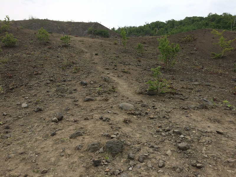 分岐を曲がると、緑が少なくなり火山らしい景色になります。