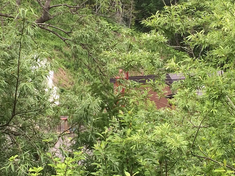 ロープが張られていて建物の前まで行くことはできませんが、木の間から建物と湯煙が。