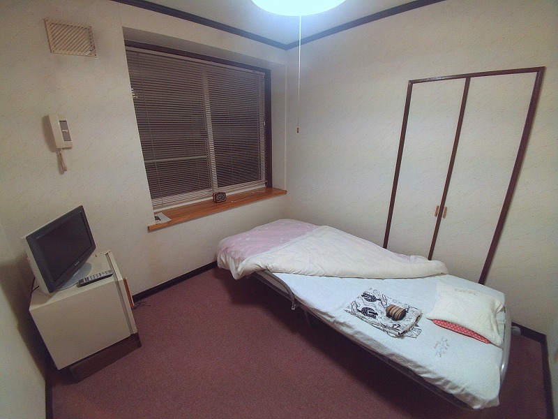 お部屋にはテレビ・空の冷蔵庫。ベッドの上に浴衣とハンドタオルがありました。