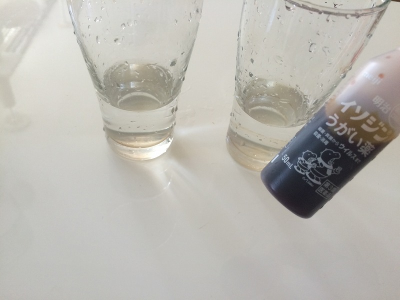 両方のコップに、ほぼ同じ量のうがい薬が入りました。