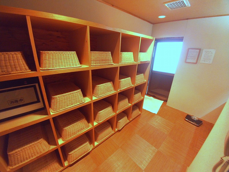 脱衣場は木の棚に脱衣かご。
