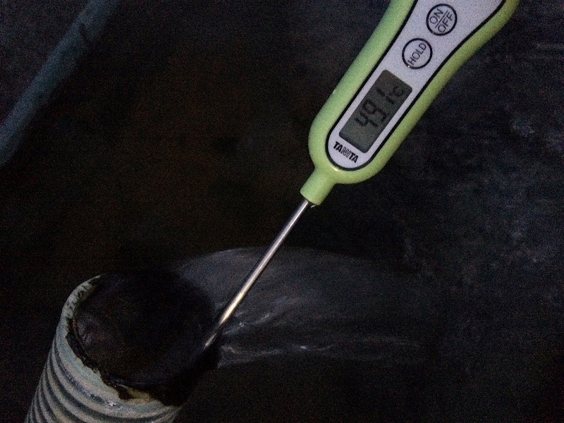 無色透明で臭いもほとんどなく、温度を測ると49.1℃ありました。温泉街の他の源泉の泉質は含重曹-食塩泉ですが、このお湯も同じではないかと想像されます。