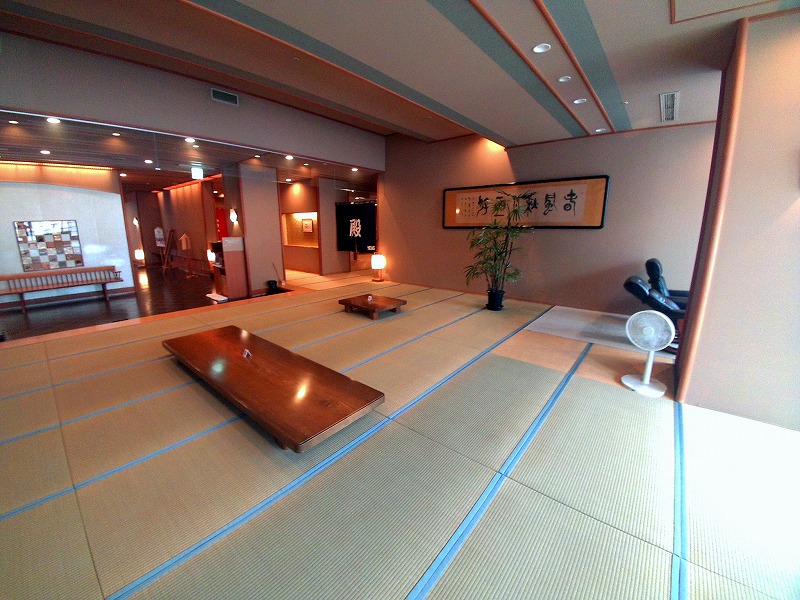 フロントで湯銭を払い、「もみじ湯」と貸切湯の話を少しだけお聞きしてから、12階の大浴場に向かいました。エレベーターを降りると、脱衣場入口の横に広い休憩所があります。