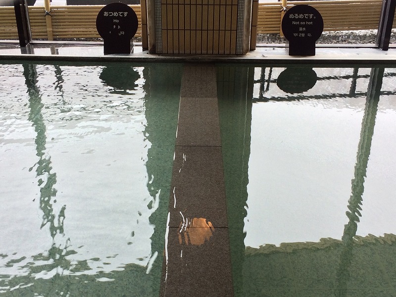 全体写真で見ると大きな一つの浴槽に見えますが、仕切りが1箇所あり右がぬるめ・左があつめとなっています。右のぬるめの浴槽は20人ほど入れる大きさがあり、入浴時39.8℃。そして左の浴槽は15人ほど入れる大きさで、41.8℃でした。