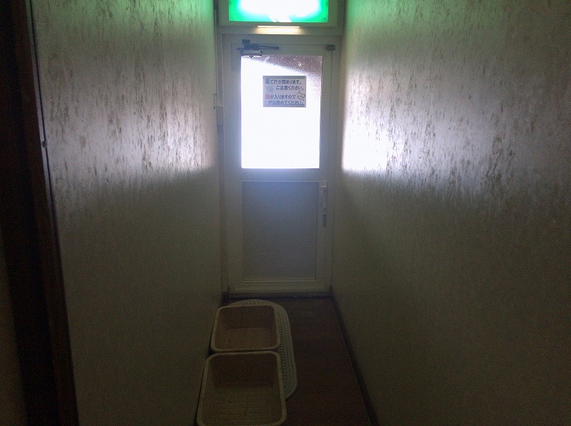 こちらが露天風呂の脱衣場です。廊下に脱衣カゴを並べたシンプルなスペースです。