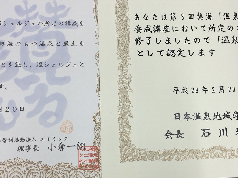おかげさまで、無事に「温シェルジェ」と「温泉観光士」の両方に認定されました。
