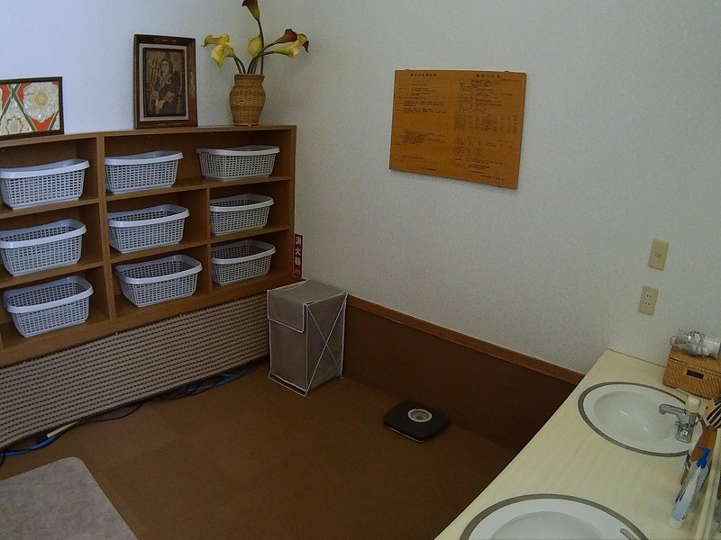 脱衣場は木の棚にプラスチックの脱衣かご。