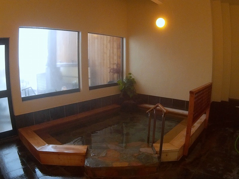 木と石の組み合わせが目にも優しい湯船は、8-10人ほど入れそうな大きさがあります。入る前にこの日の内湯は熱いという話を聞いていたので驚きませんでしたが、湯船の中で46.0℃ありました。湯船の中でかき混ぜて少し温度が下がりましたが、久々の高温浴でした。