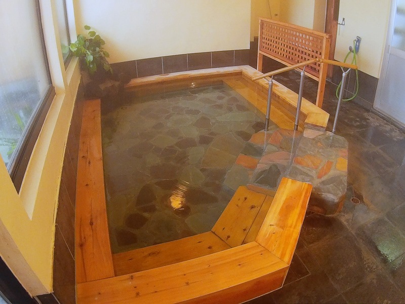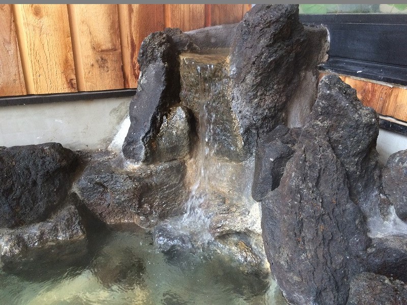 内湯は見えるところに湯口はありませんが、湯船に入る階段部分の底のパイプからお湯が出ています。思いがけず理想的な投入方法の湯口に出会って嬉しかったです。