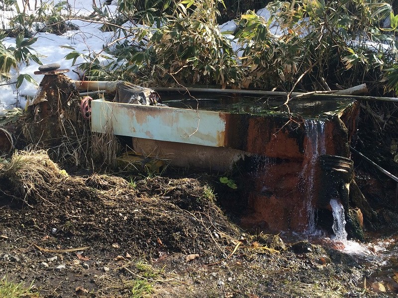 温泉仲間から教えて頂き、廃道になりつつある道を歩いて向かった先には、既に使われていない源泉が自噴していました。パイプの中をお湯が流れる音がしています。