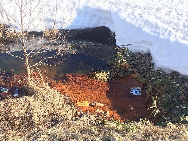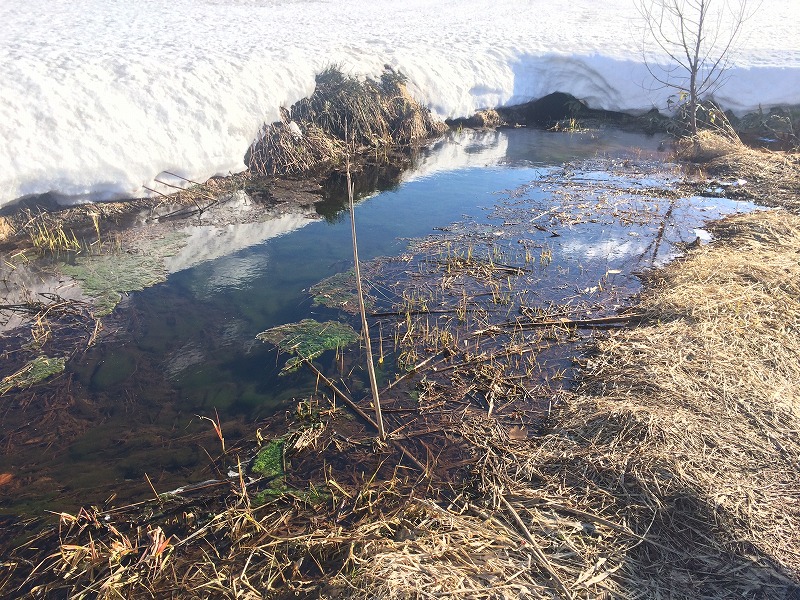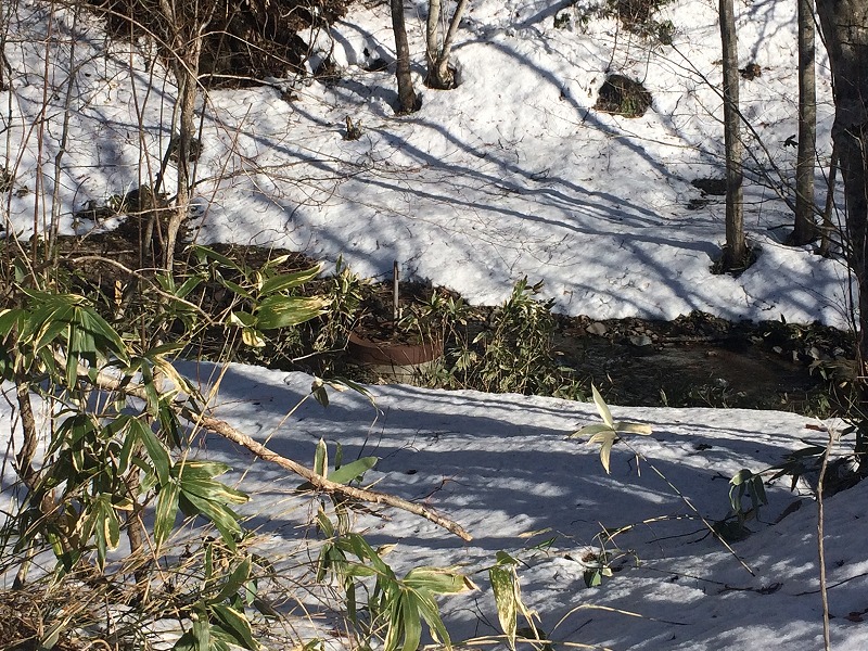 未利用の源泉が掘削されたのは宿があったよりも最近の話で、「川のそばにあるよ。今なら雪の上を歩いて行けるんでないかい」とのこと。何とか雪の上を歩いて行ってみました。