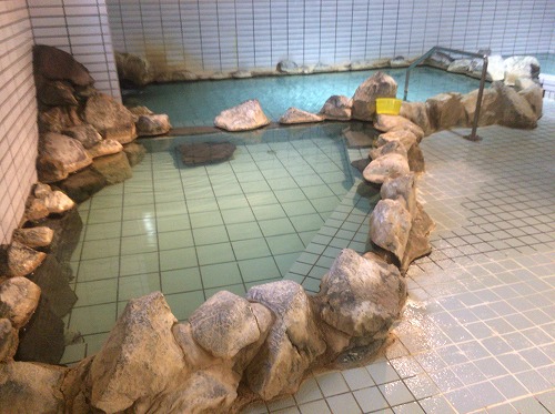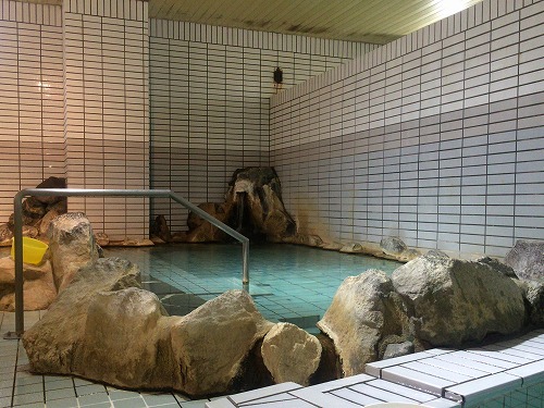 タイル張りの浴室ですが、湯船の周りは岩で囲まれた造りになっていました。