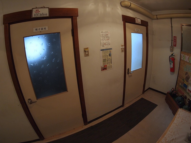 木の棚にプラスチックの脱衣かご。昭和の温泉民宿そのものの風景ですが、要所要所に中国語などで案内が貼られていて、現状に即した対応がなされていることに感心しました。