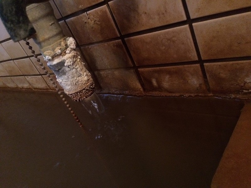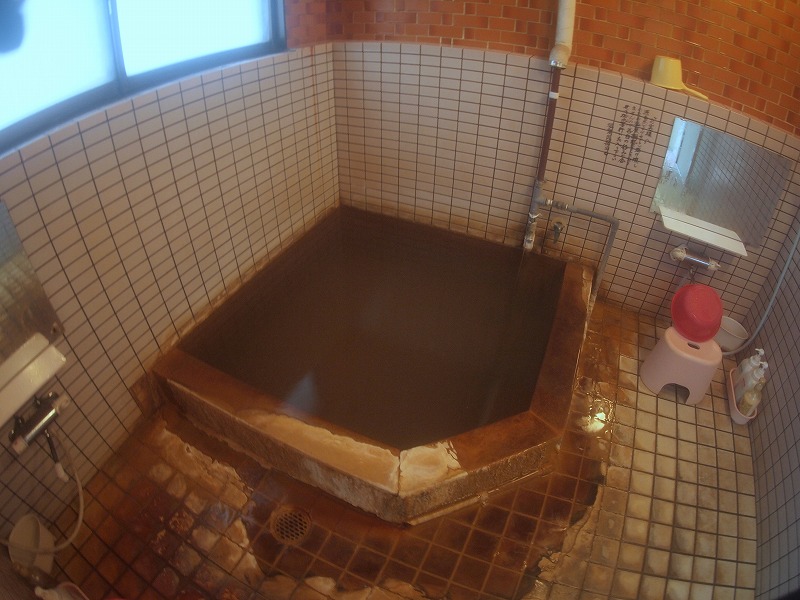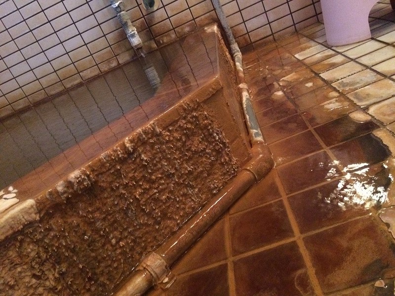お湯は湯船からかけ流され、周りを茶色く染めています。湯船の縁には控えめながら析出物がついていました。石灰華ができやすい泉質で、お聞きしたところやはり年に2回ほど送湯管のメンテナンスが必要だそうです。