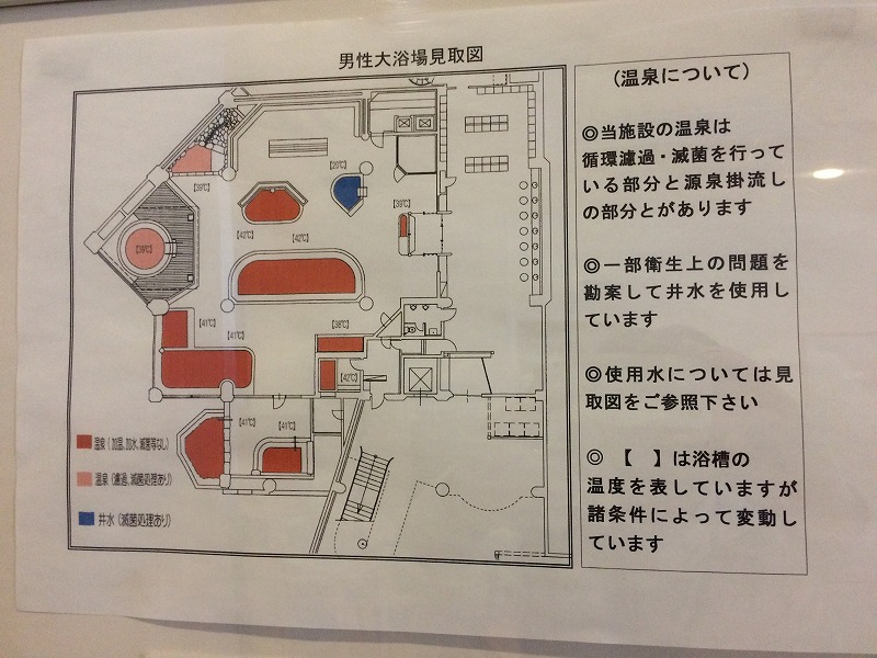 と、ここまで文字だけで湯殿の構成を書いてきたのですが、脱衣場には浴室の全体図とともに湯使いについての表示も掲示されています。